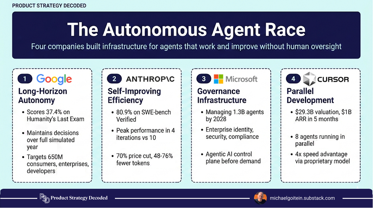 Google’s betting on long-horizon autonomy. Anthropic’s betting self-improving agents reach solutions faster. Microsoft’s betting mass agentic AI deployment needs governance infrastructure. And Cursor’s betting enterprises and individuals will adopt parallel agentic coding.