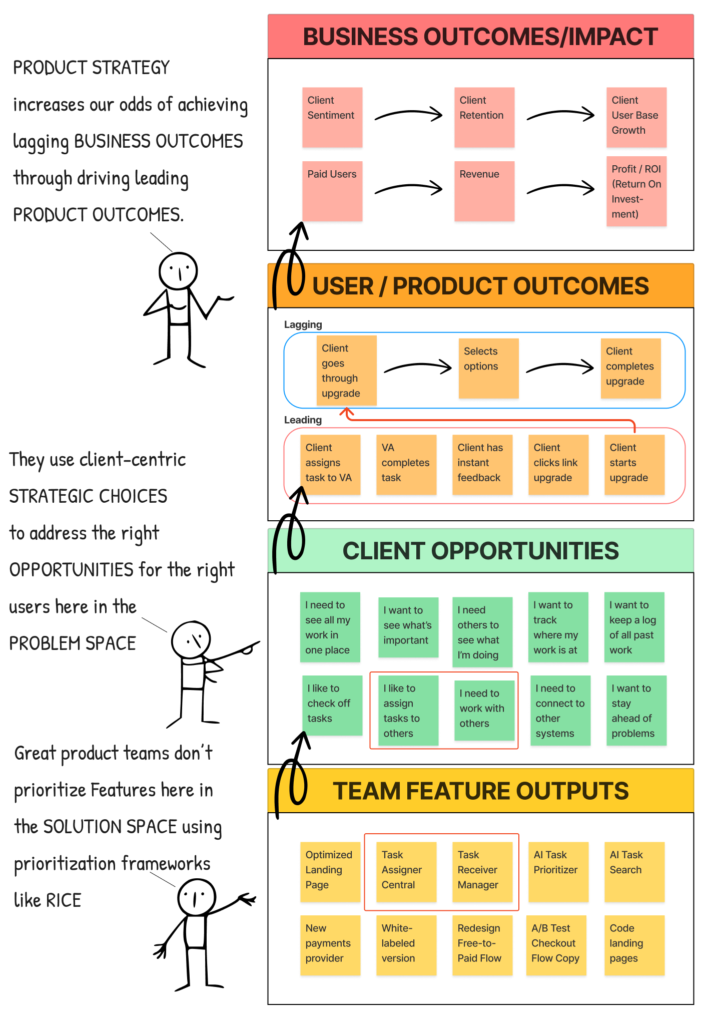 RICE lives purely at the bottom layer. It can tell you which feature scores highest based on the unscientific, wild guesses you make from among the myriad options in your backlog and roadmap. It is blind to whether any of those features address an opportunity your customers actually have.